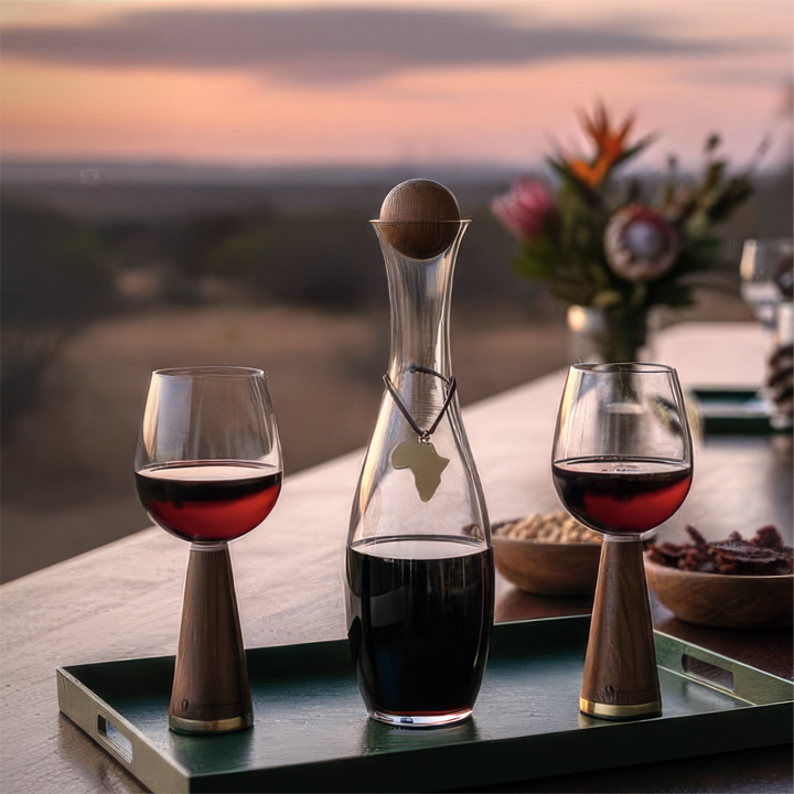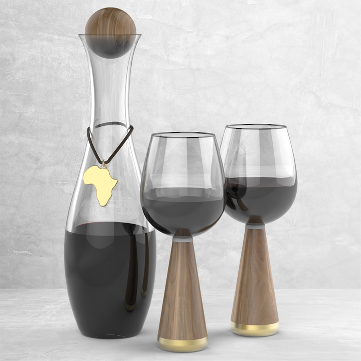 Crafted from high-quality, lead-free glass, this decanter features a striking silhouette and holds up to 1.5 liters of wine—ideal for dinner parties, special occasions, or everyday enjoyment. The design is complemented by an elegant acacia wood stopper and a gold-plated zinc alloy pendant, adding a refined African-inspired detail to your wine presentation.