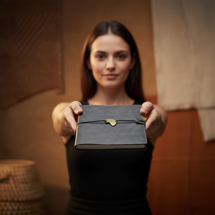 This A5 notebook is made from luxurious vegan leather that mimics the supple texture of genuine hide while remaining cruelty-free. Its stitched detailing, soft-touch finish, and compact form create a satisfying tactile experience. A black elastic band secures the notebook, while a gold-tone Africa-shaped charm adds a bold design element — a signature of the Afrique range.