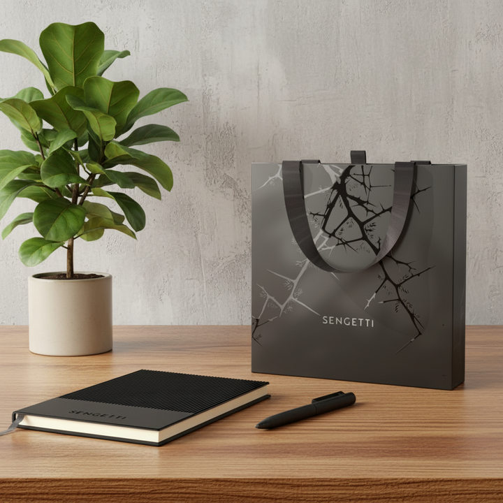 The set features a textured A5 notebook paired with a matte black metal pen, combining contemporary minimalism with tactile appeal. Each element reflects the distinctive aesthetic of the Sengetti Collection, where modern form meets subtle African design cues. The innovative dual-purpose gift box cleverly unfolds into a sleek carry bag, offering an elegant and eco-conscious presentation — no additional wrapping required.